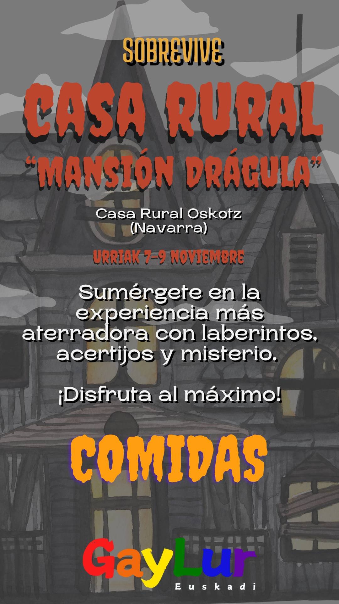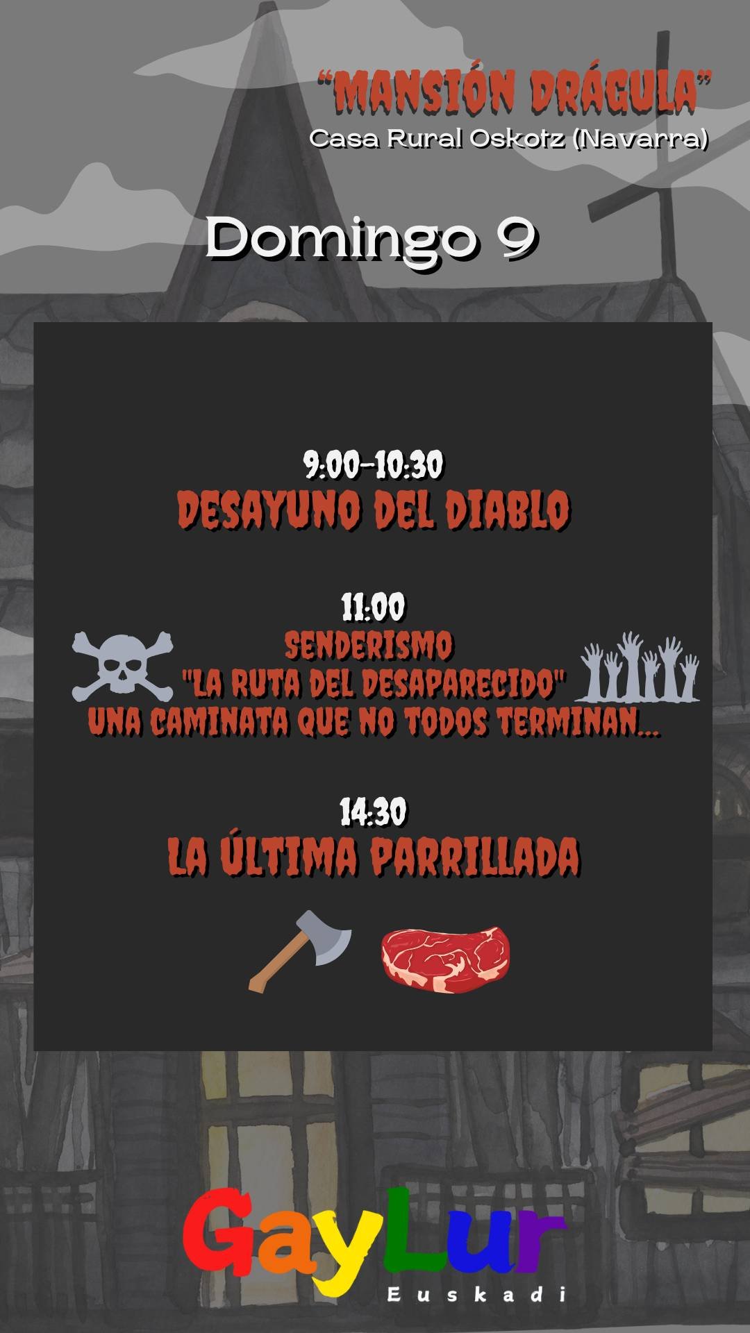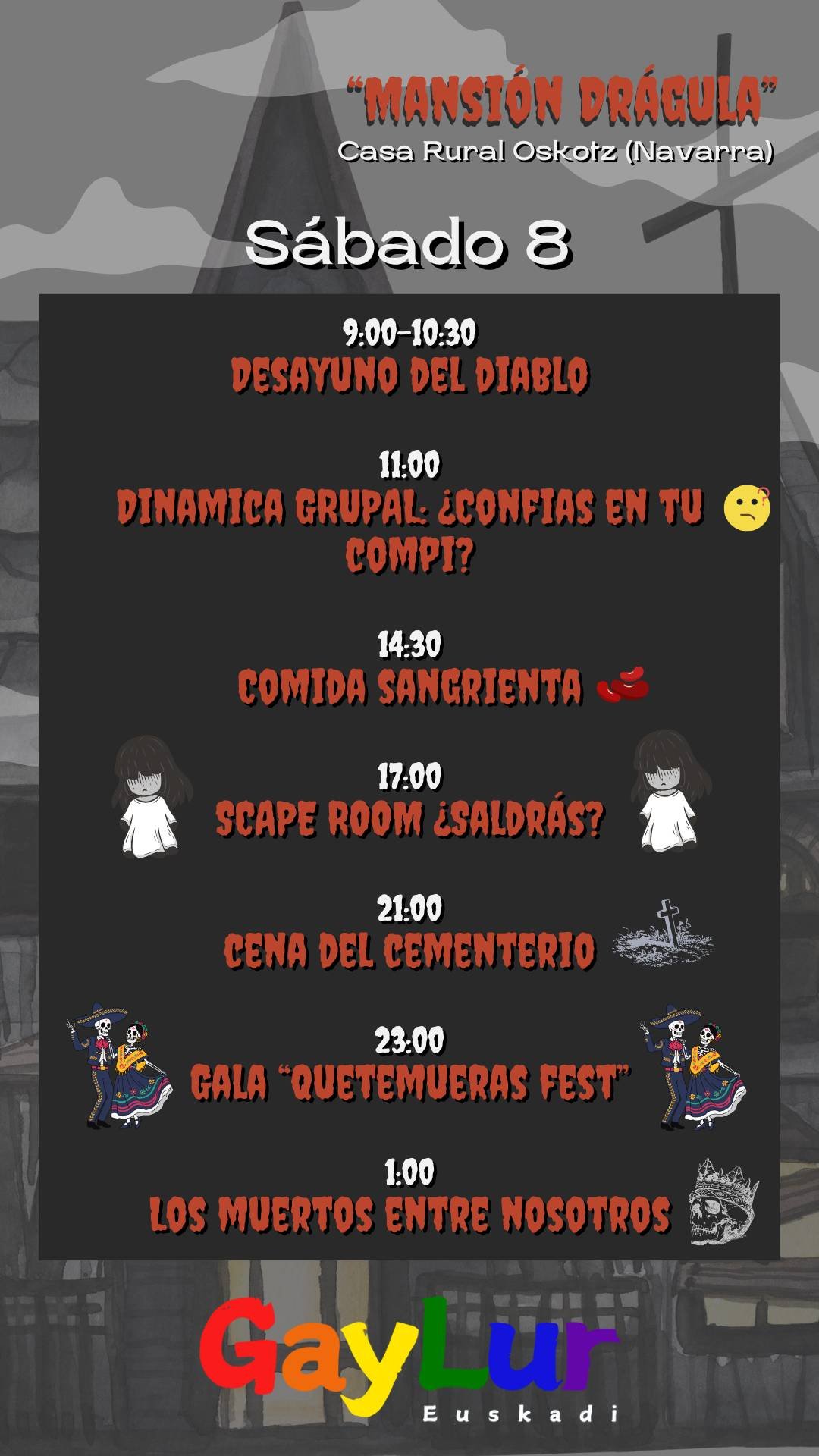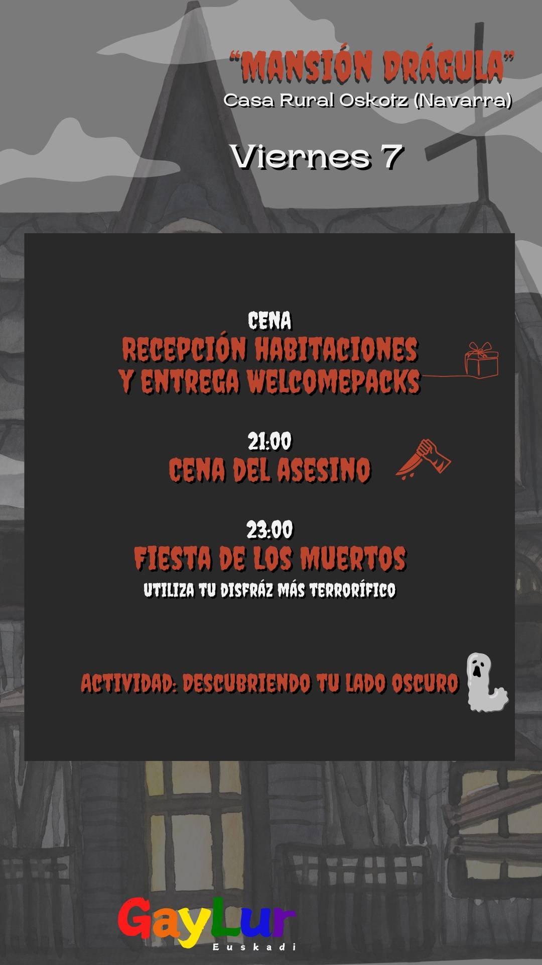 Esta no es una simple casa rural. Aquí, los muert@s bailan, los vivos tiemblan y nadie sale igual que entró. Prepárate para un fin de semana lleno de terror exquisito y diversión macabra, donde cada rincón tiene un secreto… y cada sombra, una historia.