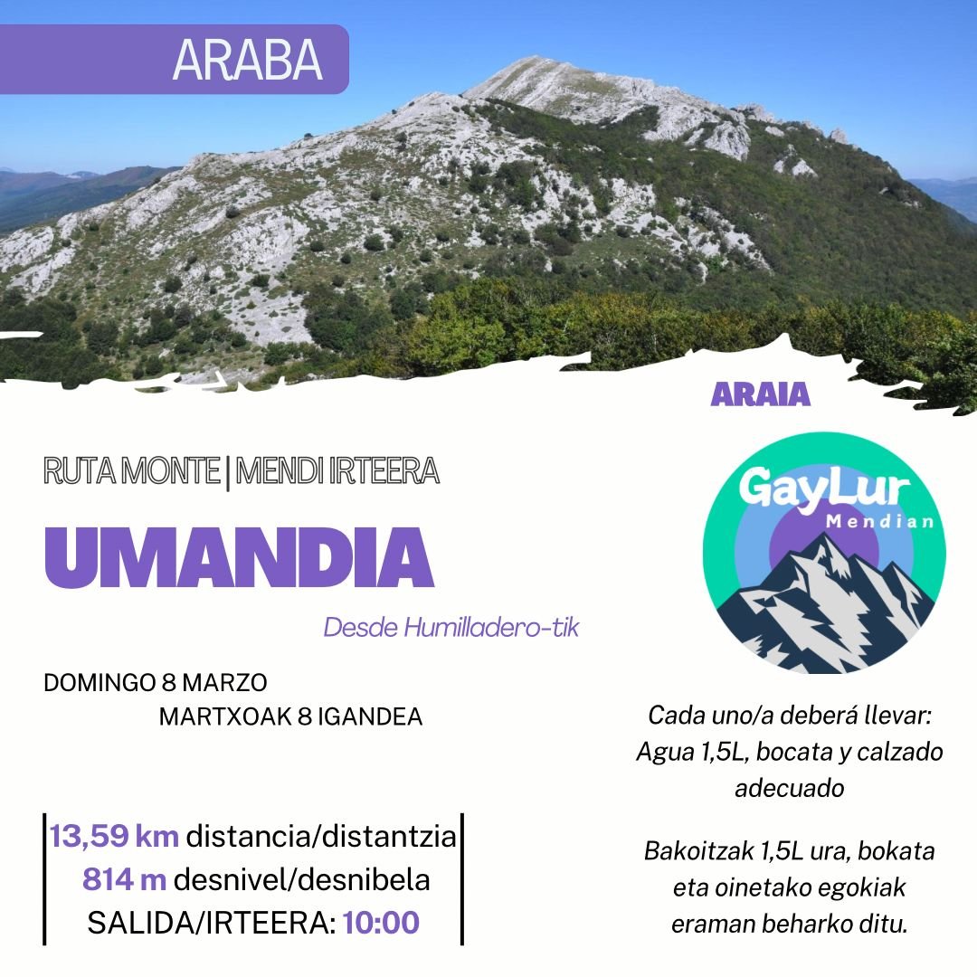 Ruta: monte UMANDIA mendia Distancia/Distantzia: 13,59 km Desnivel/Desnibela: 814 m Duración/Iraupena: 4,5h Dificultad/Zailtasuna: Moderada Día/Eguna: 08/03/26